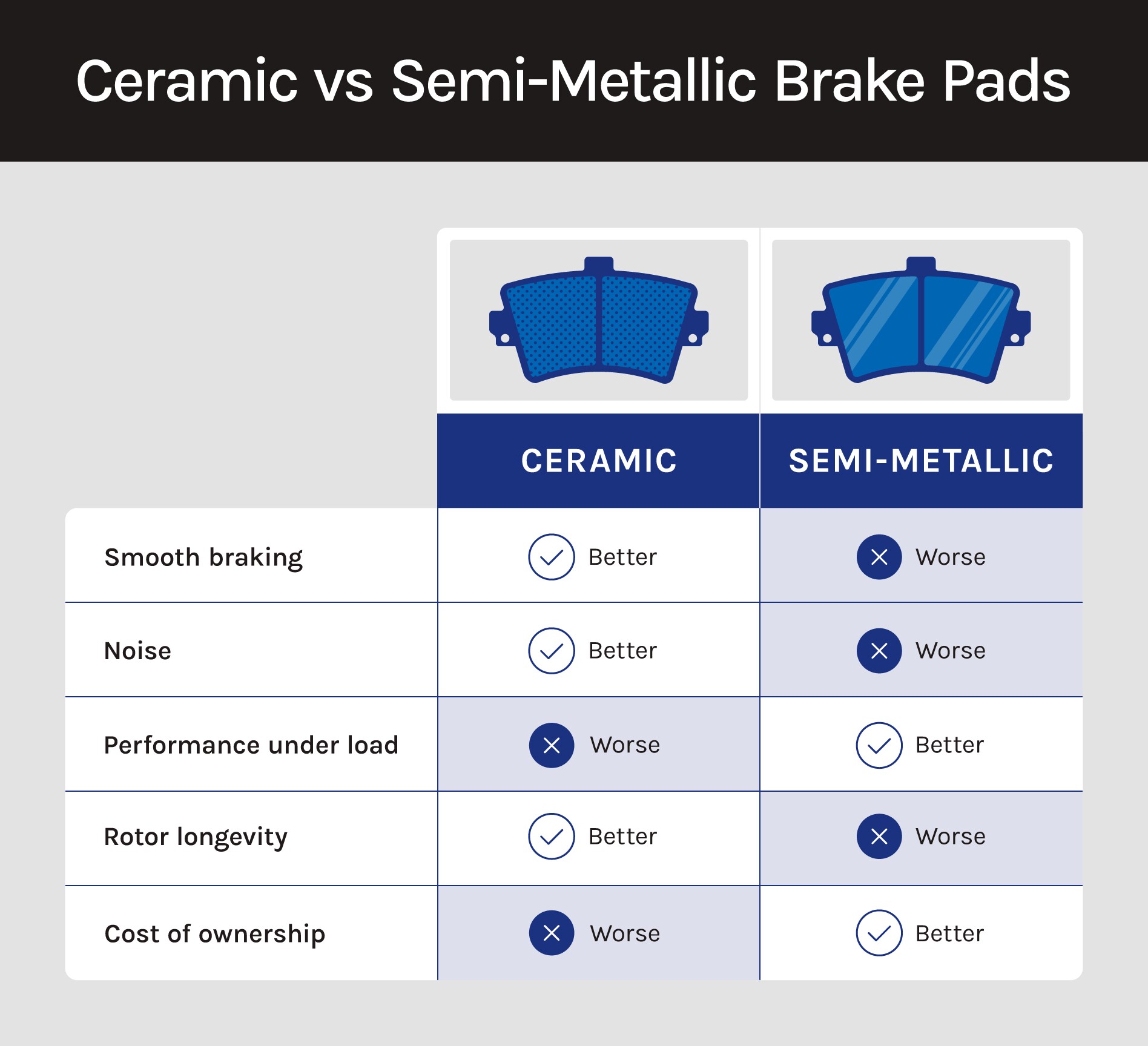 | Important caveat: Always follow the Original Equipment Manufacturer (OEM) recommendation for your brake pad type to ensure your braking system performs as designed. If you're unsure what to choose, consult your owner's manual or a trusted mechanic, or try a premium hybrid option to combine the benefits of both ceramic and semi-metallic pads. |