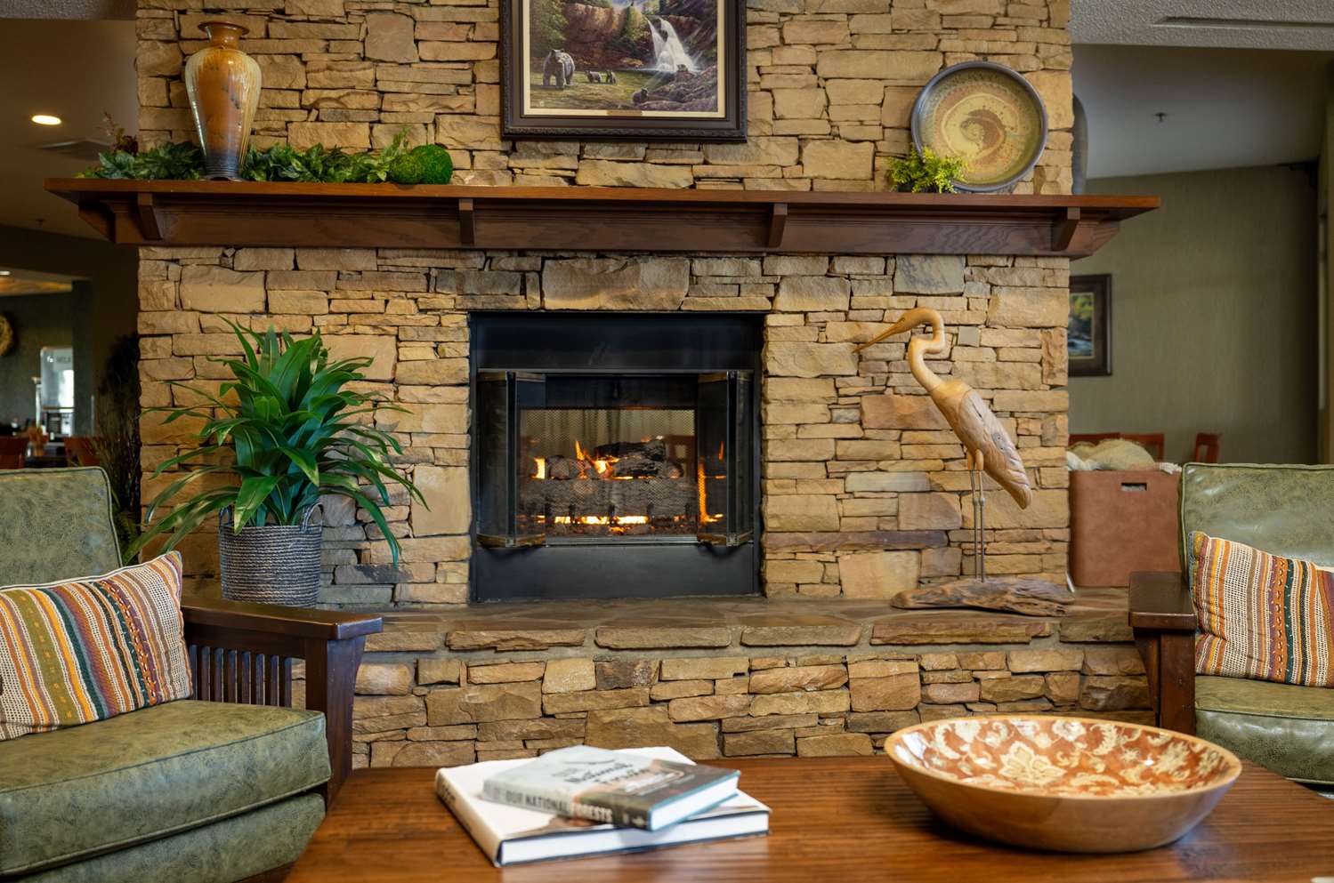 The lobby displays photo art and a stone fireplace. The outdoor patio faces the river and has a canopy, fire pit and heater for inclement days. Enjoy the full breakfast bar and EV charging stations. Interior Corridors, 4 Stories, Smoke Free, 128 Units