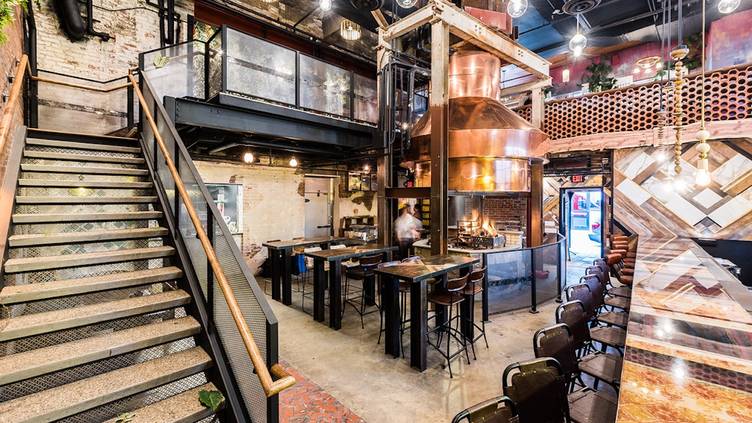 The copper-hood on the massive wood-fired hearth is the center of the bi-level space with a decidedly Bohemian vibe meant to invoke a bustling market square. The best way to dine is the “Tawle” experience; multiple small plates are presented family style to best sample the multiple fire-roasted meats, seafood, and vegetables as well as hearth-baked puffy flatbread to smear with the wonderful spreads.